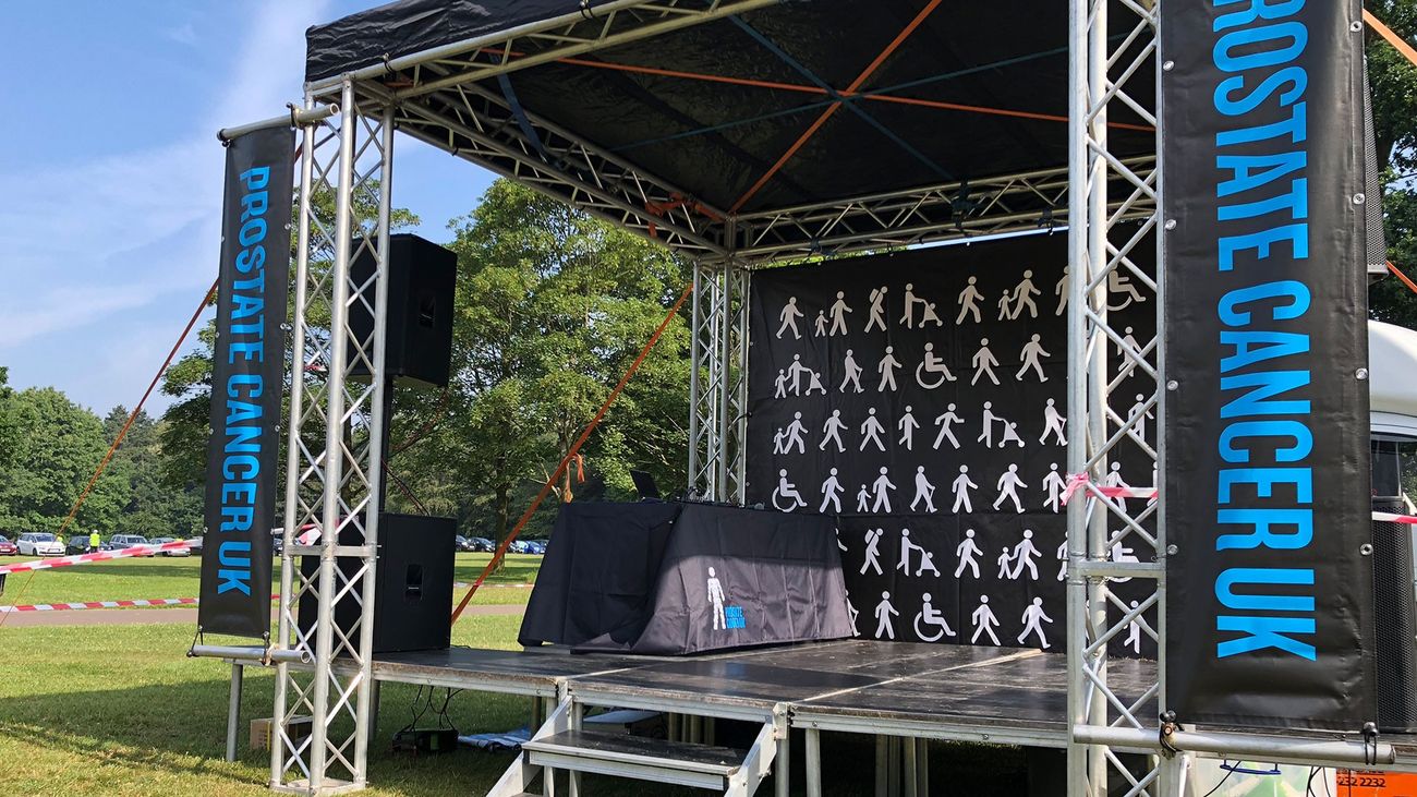 We deliver the full event production package — main stage, PA, LED screen and start/finish gantries — branded throughout for Prostate Cancer UK. Our crew rigs and operates the equipment at each location so the day runs to schedule.